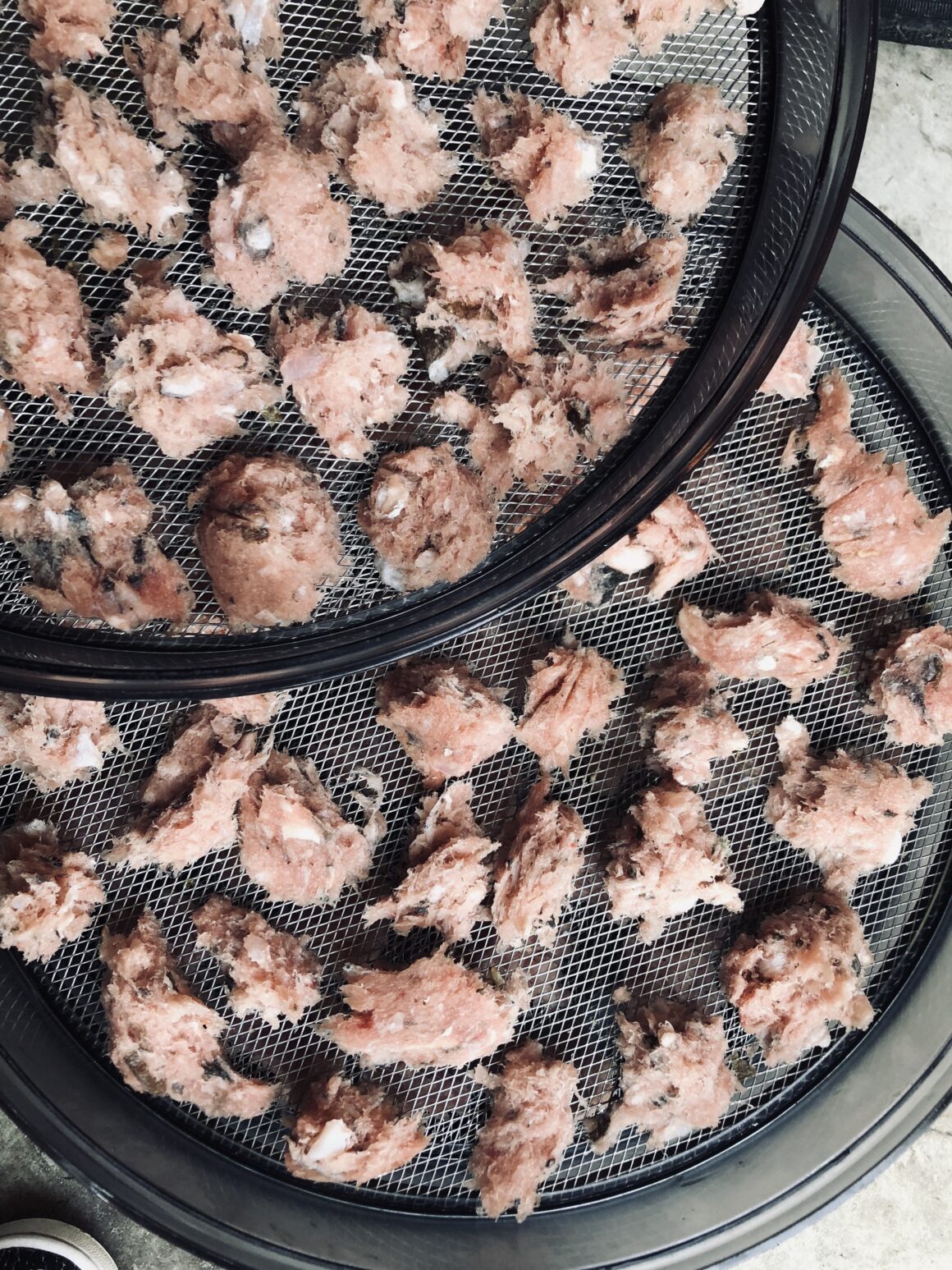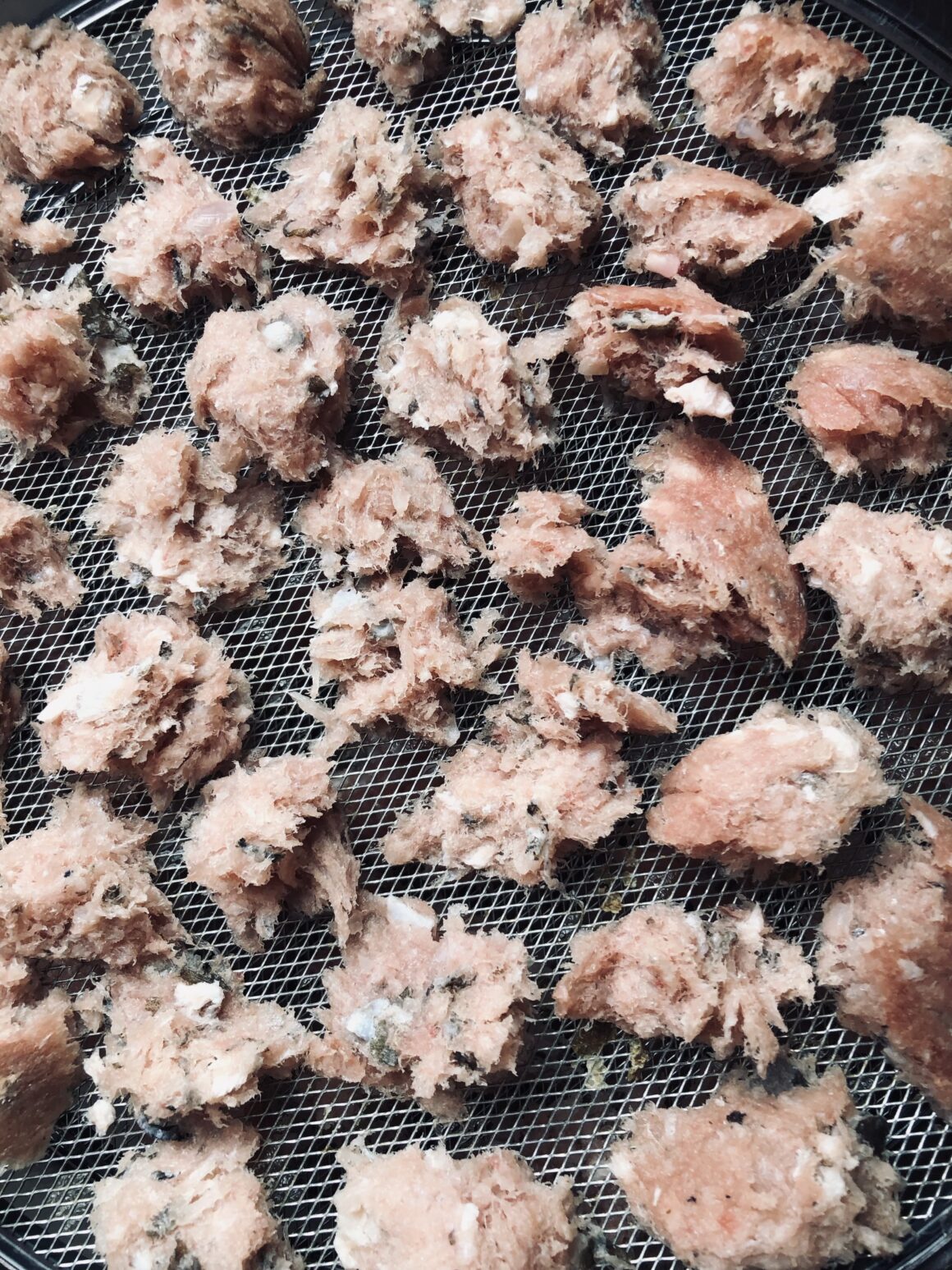 Soms krijg ik iets in handen waarvan ik meteen denk: dit ga ik anders aanpakken. Zoals in dit geval een kilo gemalen witvis. En hoewel ik geen KVV voer, voelt zo’n rol voor mij al snel als “te veel van hetzelfde” en ook gewoon heel erg gemalen. Maar juist daarom zag ik er een leuk projectje in door ze te drogen als snacks, want aan zomaar weggooien doe ik niet.