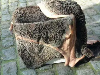Hier zie je een hele runderpens, gedrapeerd over een emmer. Een runderpens van een volwassen rund weegt zomaar 15 kilo!